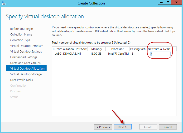 For the Virtual Desktop Allocation screen, here we can specify which hosts we want the virtual machines to reside on. In this example, I only have one virtualization host so there is not much I can change, however if there were multiple virtualization hosts, you can specify how many machines you want created on each host. So if we were creating 100 desktops across 4 RD Virtualization Hosts, we can even out the distribution by putting 25 virtual desktops on each virtualization host. Hit next.