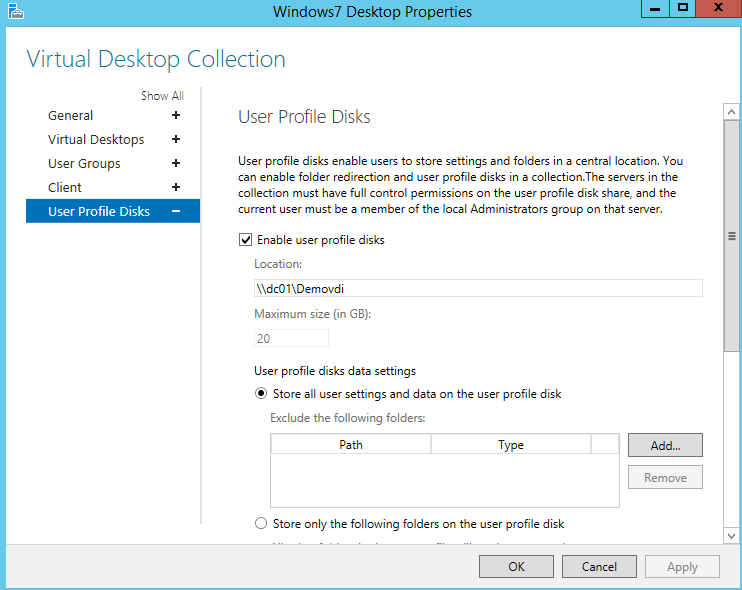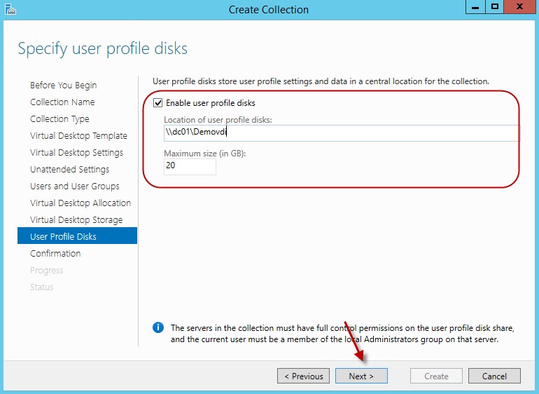 Since we are not using a third party solution to handle user settings, let’s go ahead and enable user profile disks. Specify the correct directory for the profile disks and hit next. Should you use a third party solution to handle user settings (user profiles), deselect the option “Enable user profile disks”. More information on configuring profile disks can be found here.