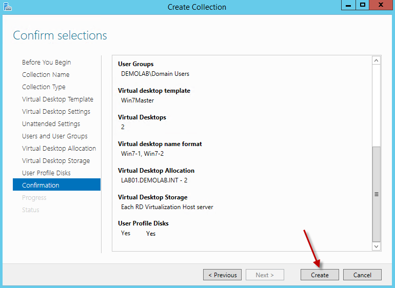 The other option is to allow the RDS farm to automatically create and manage the virtual desktops. When this option is selected the RDS farm will create new virtual desktops based on the virtual template, recreate the virtual desktop based on changes made to the virtual desktop template, and store user settings on a user profile disk. If the option is not checked, it will assume all virtual desktops have already been pre-created and only require an assignment. For our example, we will leave the option checked. Hit Next.