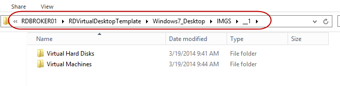 In Part I, after we deployed out RD Virtualization host, we specified the virtual desktop export location within the RD farm deployment properties. This is where the virtual desktop template is copied. If we browse to the location, we can see the virtual desktop template and its associated files: