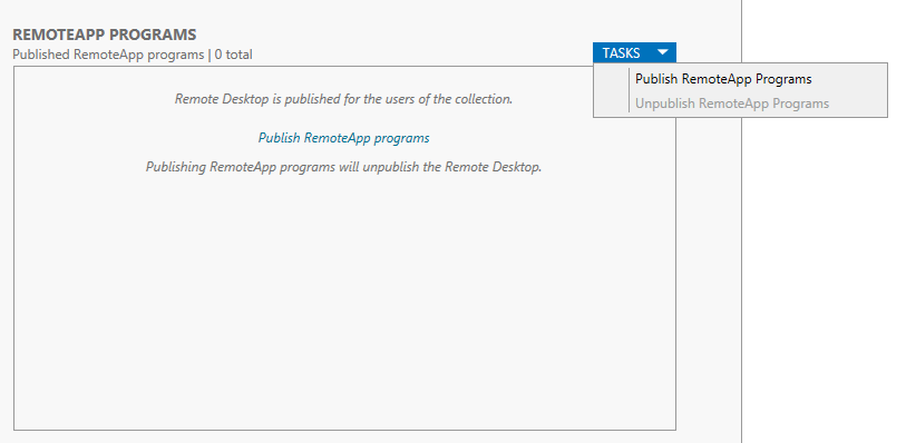 For the RemoteApp Programs section, we can unpublish the virtual desktop and instead publish individual RemoteApp programs which are installed on the virtual desktops. This option could be used for applications which are not compatible to run on a server OS and require a client operating system like Windows 7.