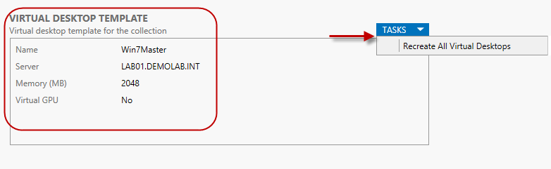 Finally, we have the virtual desktop template section. Here we can see the virtual desktop template which is being used as well can recreate the virtual desktops should we make a change to the virtual desktop template.