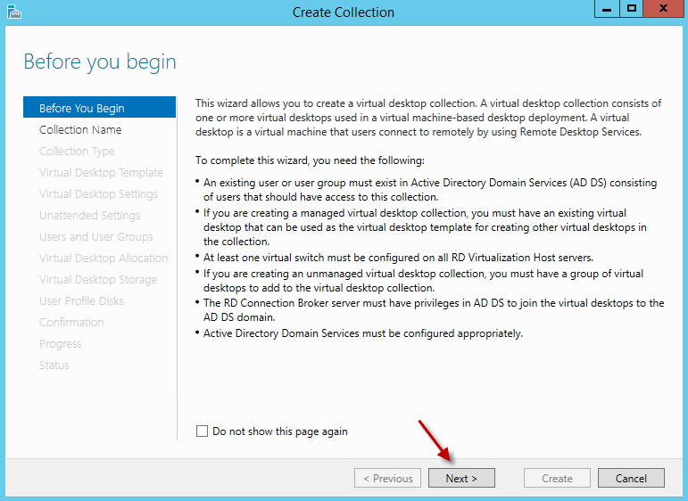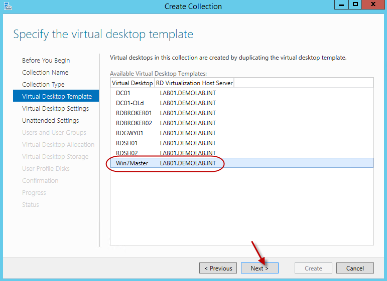 Now that we have our virtual template ready, we will first need to create a new Collection for the Windows 7 desktop. Within RDMS in Server Manager on the Deployment Overview section, right-click on RD Virtualization Host and select the option “Create Virtual Desktop Collection”