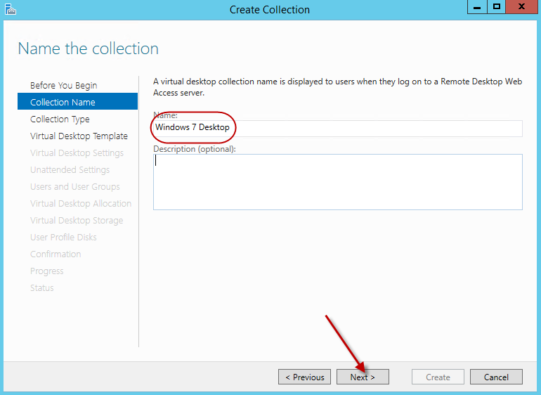 On the Collection Name screen, go ahead and name the collection. Here I named the collection Windows 7 Desktop. Hit next.
