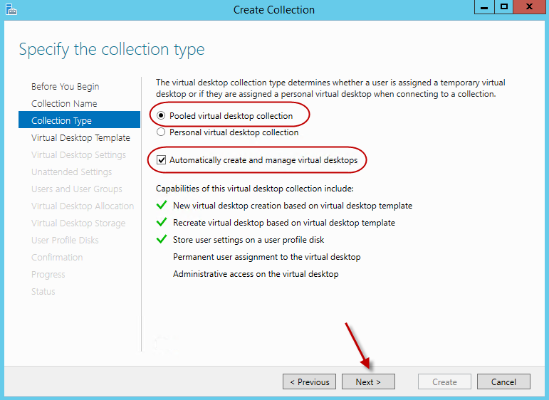 On the collection type screen we are presented with 2 options. One is a pooled desktop and the other is a personal desktop. A pooled desktop is a desktop which is based on a shared desktop image. When a user logs out, the desktop is reverted back to its original state. A personal desktop is one which will be assigned to a user and the user will use this desktop going forward. Any changes made to a personal desktop is retained. For our example, we will choose the pooled virtual desktop collection.