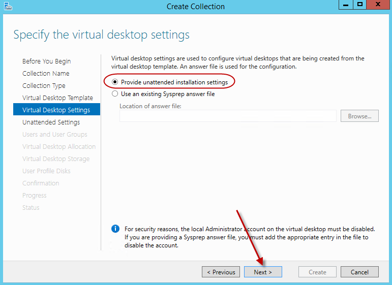 On the specify virtual desktop settings screen, select the option “Provide unattended installation settings” and hit next. Should you have an answer file already prepared, you can browse for it on this screen. Since we do not have an answer file, will provide the installation options within the wizard.