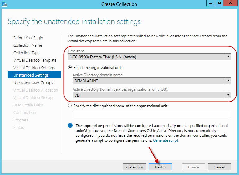 For the unattended installation settings screen, select the appropriate time zone, correct domain, and the designated OU where the virtual machines computer accounts will reside. Hit next.