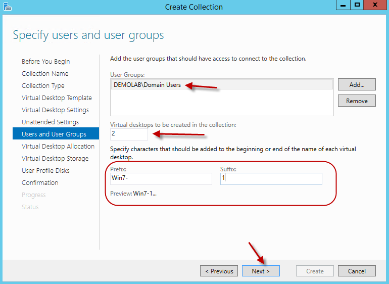 On the specify users and user groups screen, we can add the user group(s) which will have access to the virtual desktop collection. To keep things simple, I’ve added domain users. Here we also need to specify how many desktops we want created along with the naming scheme for the desktops. For this example, I’ve set it to create 2 virtual desktops. As for the naming scheme, I’ve set the prefix to Win7- and the suffix to start with the number 1. This means the desktops will be named Win7-1 and Win7-2. Hit next.